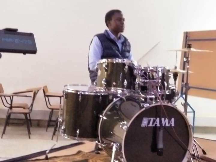 Vincent Tumaini, our drummist, playing the recently acquired instruments during a church service.